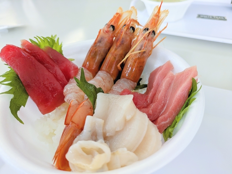 1つ前で紹介した写真ですが ご飯200円+海老200円+まぐろ中トロ350円+ホタテ300円の合計1,050円の海鮮丼です。ホタテはまだ殻についているものを その場で捌いて丼に載せてくれるから超新鮮。
