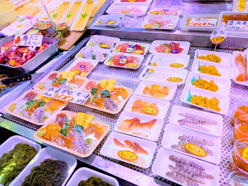 小さな市場といった感じですが まずは200円でご飯を購入(無料で あら汁付)します。あとは 市場内の店舗からネタを選ぶのですが 写真のように1品ずつ選ぶ以外に 各店舗 おまかせセットがあって500円です。盛り付けも お店の方がやってくれるので安心です。