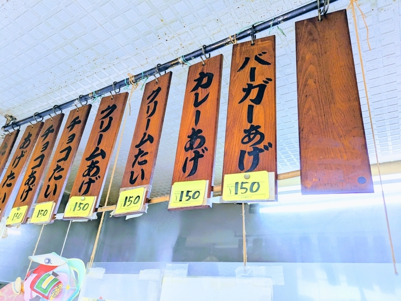 ここでメニューを見て驚きなのが カレーあげとバーガーあげ。甘いものだけでなく しょっぱい たい焼きもあるのは驚きです。ちなみに このしょっぱい系の たい焼きには砂糖は振られません。