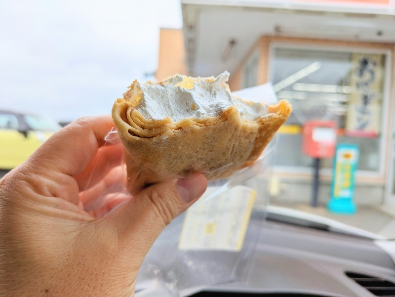 こちらが 一口 二口と食べた感じですが クレープの中には 生クリームがぎっしり!ただ生クリーム以外は「なにも入っていません。」ということのようです。
