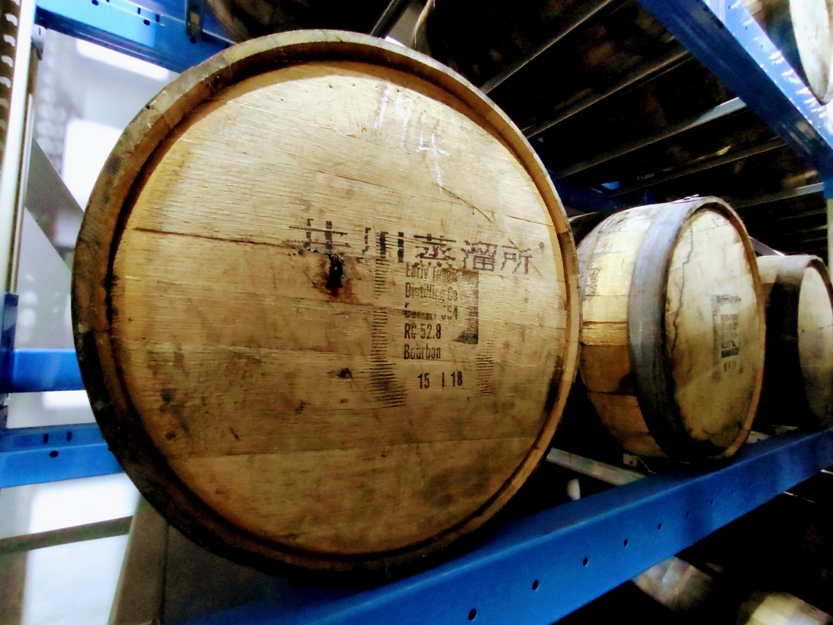 蒸溜所内の樽ですが写真のよう数字が書かれています。上の社員では1の番号が書かれています。樽詰めされた順番に番号が付されていくので この樽が井川蒸溜所で最初に樽詰めされたもの…ということになります。