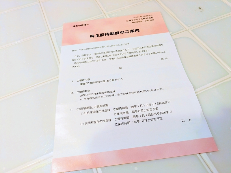 そんな三菱マテリアル株式会社の株主優待は 三菱マテリアルらしさが出た内容となっています。そして 三菱マテリアル株式会社の株主優待の凄いところは 通常 株主優待となると単元株と言われる100株~というものが ほとんどですが たった1株の株主であっても 株主優待をゲットすることができます。これなら簡単に株主になったり優待を得るチャンスがありますね。