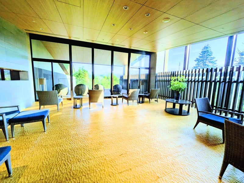 スパ棟2階 大浴場みやまに入ると写真の湯上り処があり その先に男女別の大浴場入口があります。男女入れ替え制になっているので チェックイン日・チェックアウト日と入れば 両方の湯舟を堪能できます。露天風呂や 大浴場の窓からは 正面に雄大な浅間山を眺めることができます。