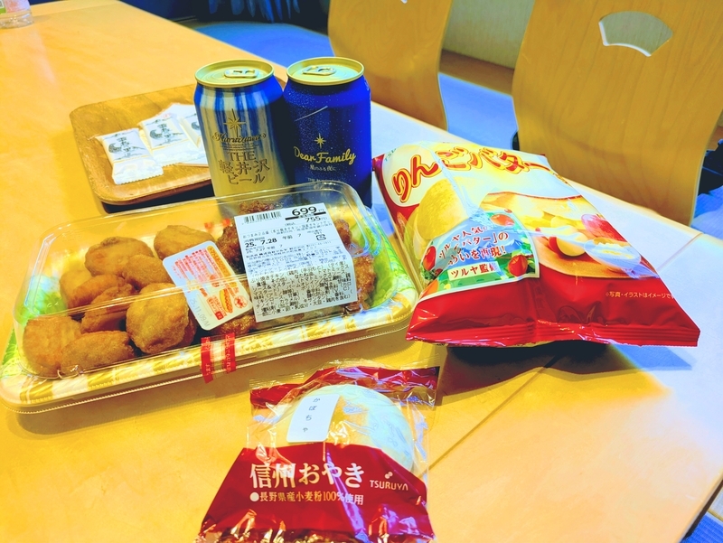 宿泊日には やや遅い時間に昼食を目一杯食べていたので 小腹を埋める程度のものを購入してチェックインしました。おつまみを購入し あとは 信州と言えばの おやき や ツルヤとCalbeeのコラボ商品 ポテトチップス リンゴバター味も購入してみました。