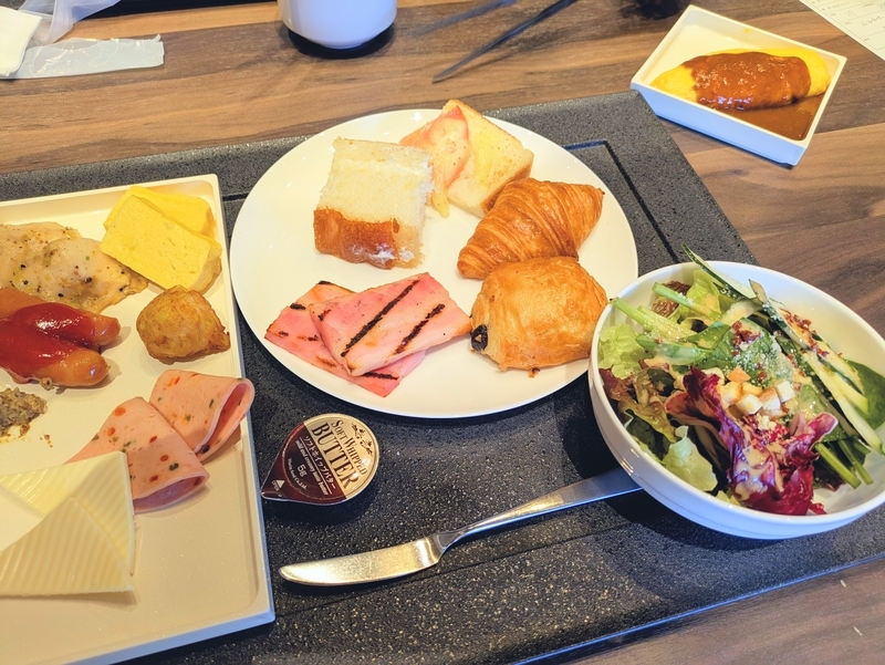 朝食は フロントがあるセンター棟1階にある asama dining でいただきました。クロワッサン等のパンを焼きあげているということで 普段は和食系なのですが 今回はパン食にしてみました。人気のクロワッサンは 焼き上がり時間がビュッフェテーブルに表示されています。
