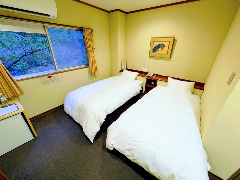 本館3階 山側和洋室ツインです。お部屋の入るとベッドが2台並んでいます。