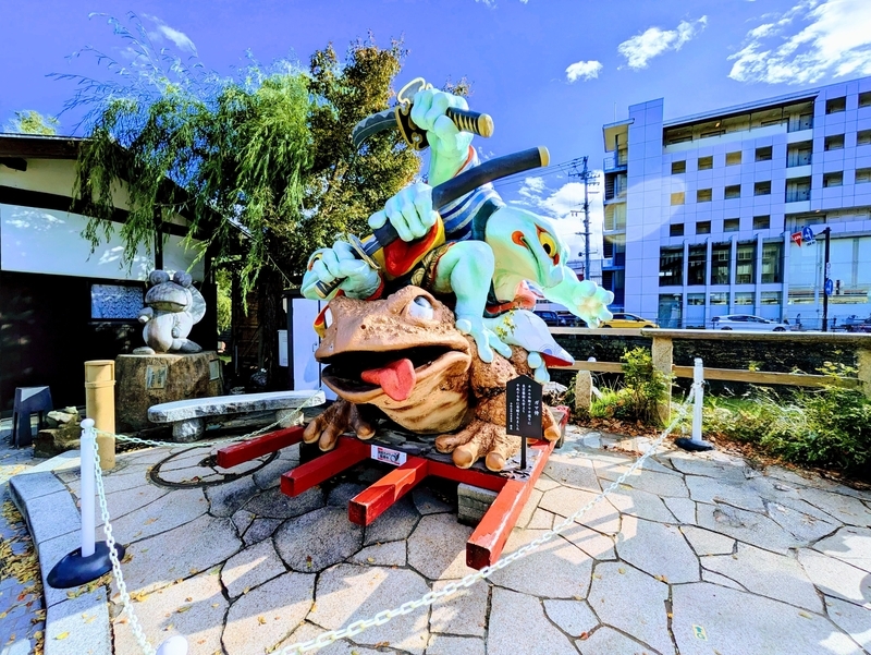 ナワテ通り商店街の入口にはシンボルのカエル像があります。かつていたカジカガエルは清流にしか生息せず 背後に流れる女鳥羽川に清流を取り戻したいという願いも込められています。
