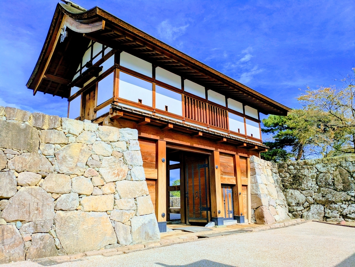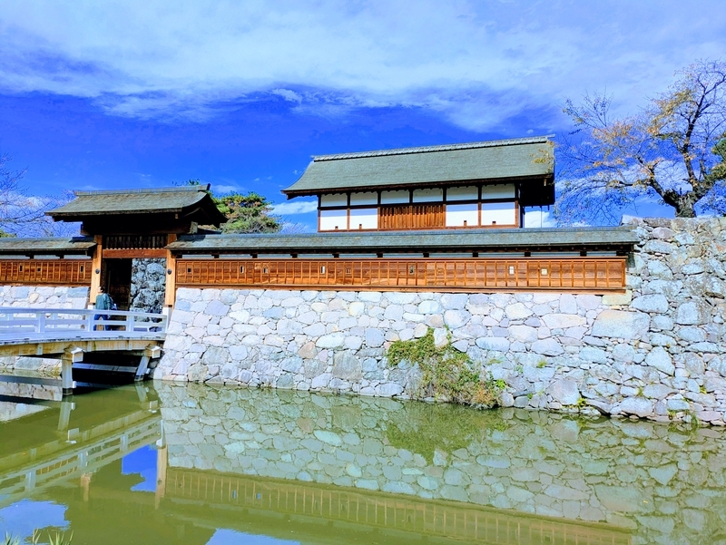 明治時代に入り廃城となったため 現在は城跡となっていますが 写真の太鼓門等が復元されています。堀・土塁・石垣は国指定の史跡になっています。本丸跡等は公園になっていて 無料で散策することができます。