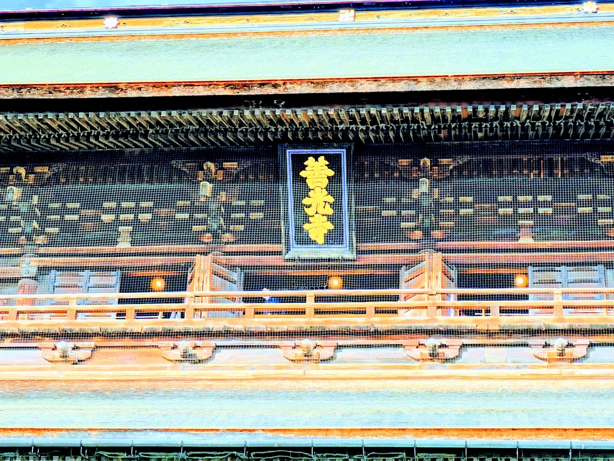 善光寺の三門と言えば この「善光寺」と書かれた額が有名です。この善光寺という字の中に 牛が一頭、鳩が五羽いるというのですが…どこにいるか わかりますか?