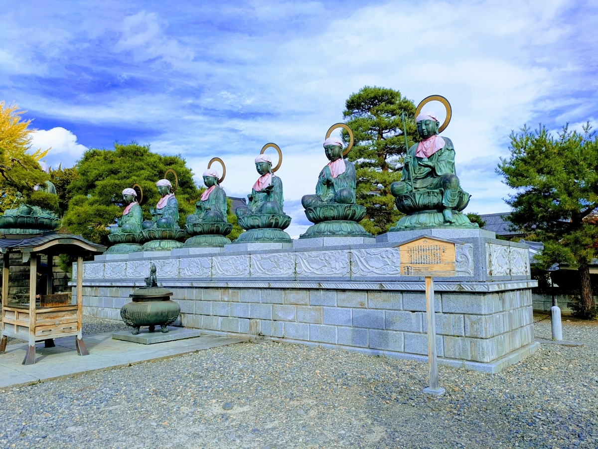 その山門が見えている時に 参道の右側に写真の六地蔵があるかと思います。注目なのは 一番右側の地蔵様です。座禅を組んでいるはずの足が外に出てしまっています。この地蔵様は地獄界の地蔵菩薩様なのですが 一刻も早く救いに行こうという気持ちが表れていると言われています。