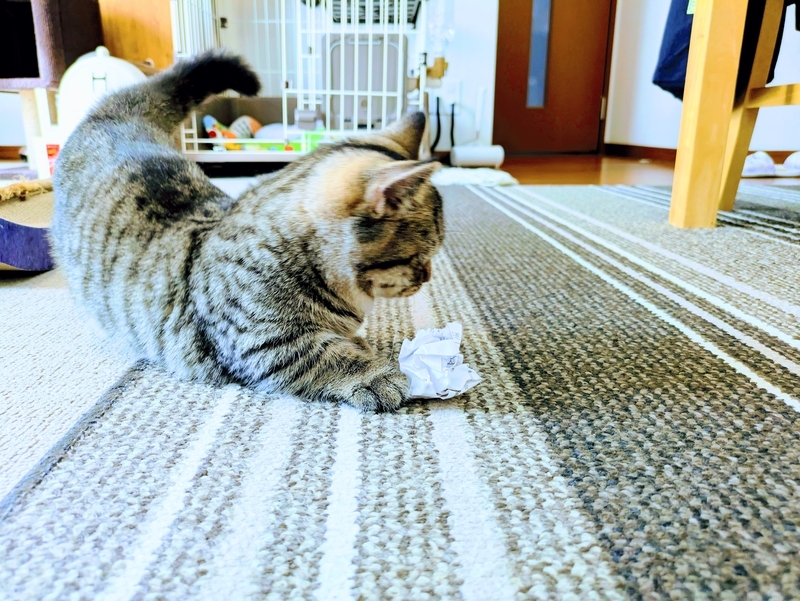 前回のわさび日記で 外遊びをさせるために 様々な オモチャを購入してみたのですが 結局は 金の掛からないオモチャに夢中になっています。一番大好きなのは 家に届いた郵便物を読み終えたあとにクシャクシャっとしたもの。これは 狂ったように追いかけます。
