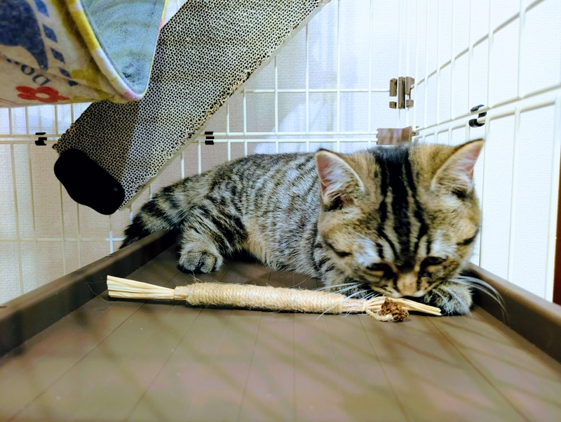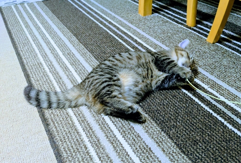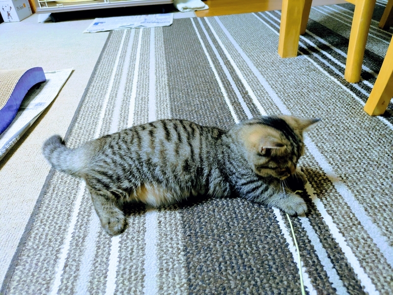 そして 猫じゃらしも それなりに喜んだのですが 激しく遊ぶために 安いものは すぐに壊してしまい 壊れた猫じゃらしには興味を失うようで…次に興味を持ったのは 捨てようかと思っていたゴム紐。