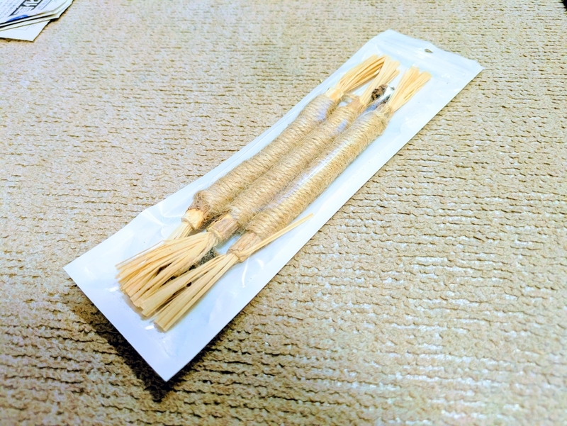 通称 またたびトイと呼ばれるもので またたびの木に爪とぎ用の麻ロープが巻き付けられており 両端には歯みがき効果のあるラフィア草が付いています。ラフィア草の一端には 虫癭果(ちゅうえいか)が付いています。