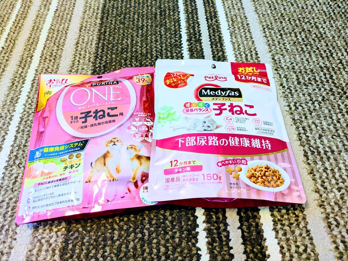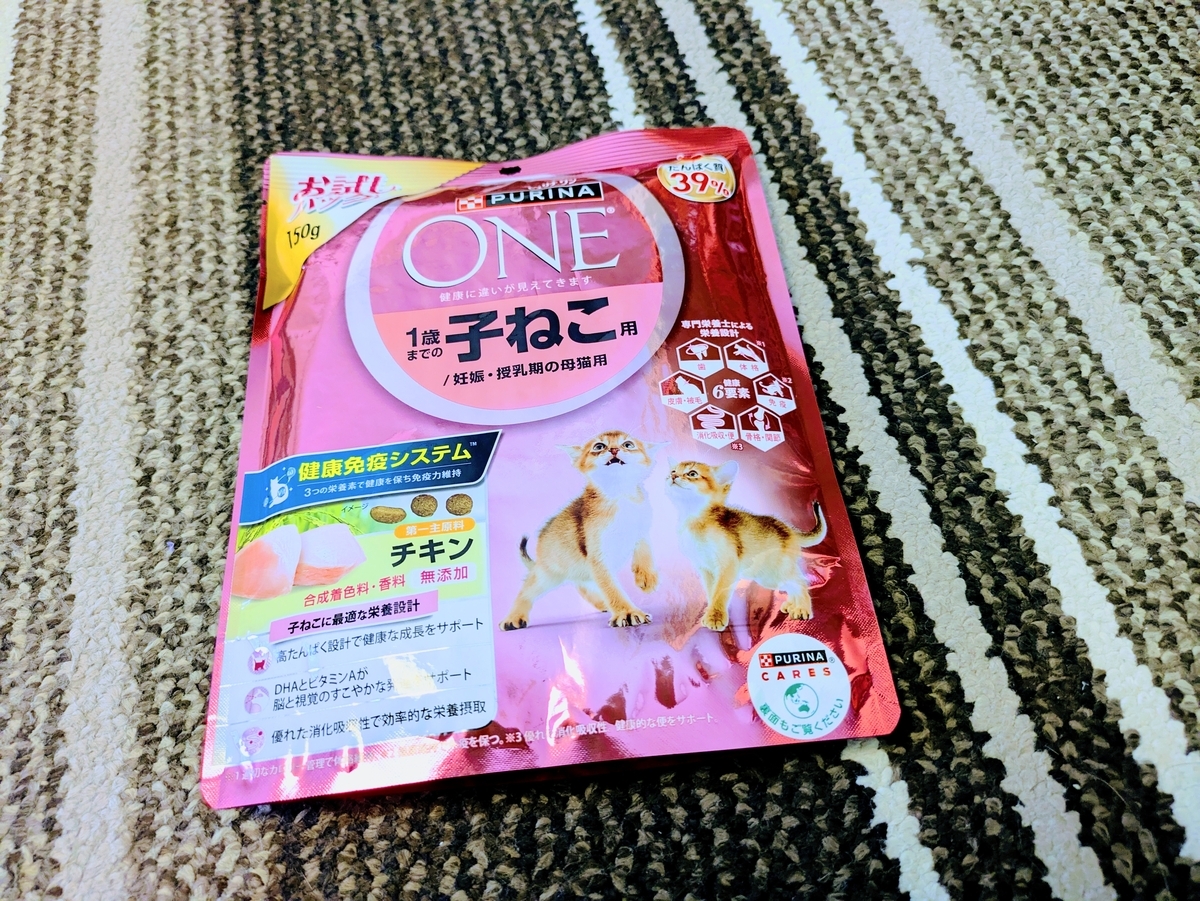 ということで 値段もそれなりにリーズナブルでありながら糖質の低かった ピュリナワン 子供用にしました。近くのホームセンターで購入して約2kg2,180円です。
